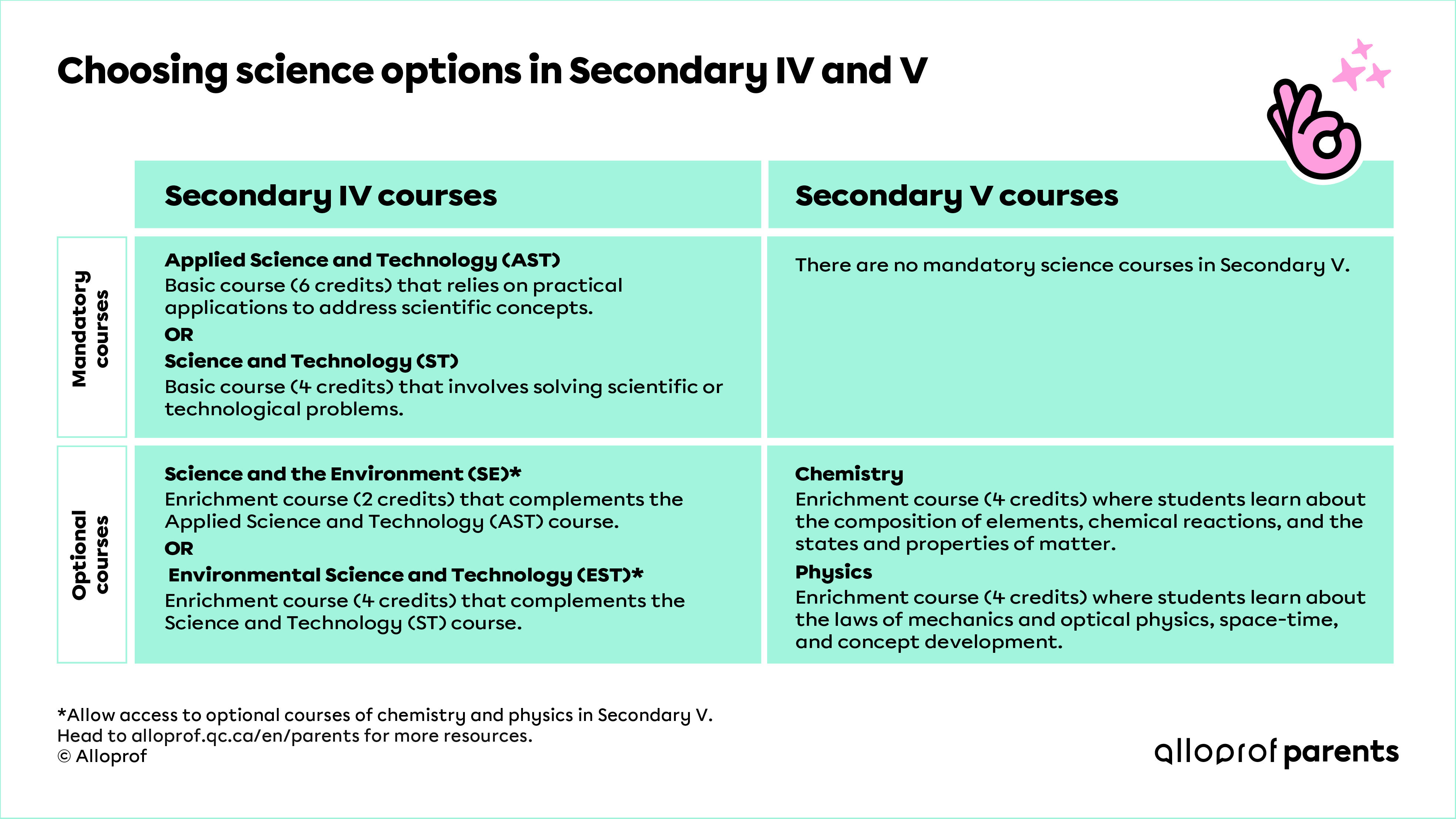 In Secondary III and IV, students are asked to choose between two compulsory courses: ST (Science and Technology) and AST (Applied Science and Technology).