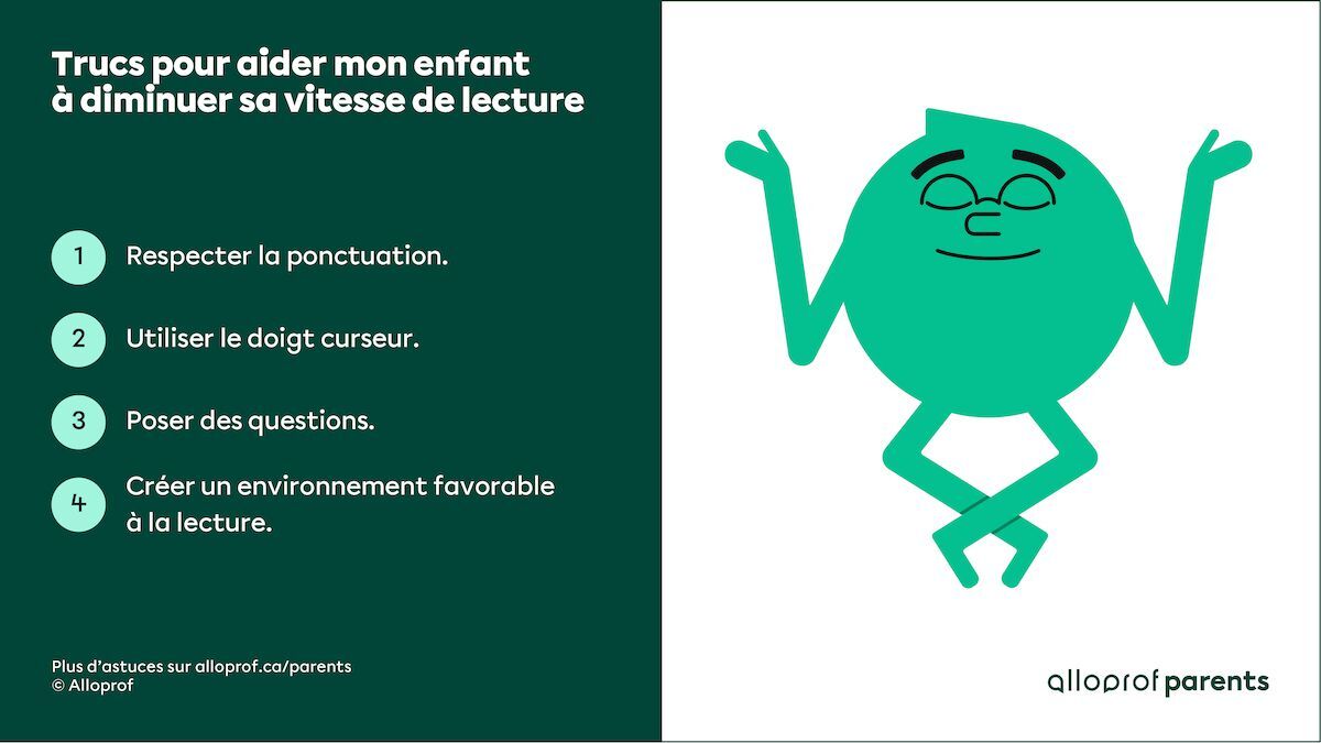 Pour ralentir le débit de lecture, et pour vous assurer que votre enfant comprend bien le texte à l’étude, vous pouvez lui suggérer un petit retour en arrière après chaque paragraphe. Vous pouvez lui poser quelques questions comme :