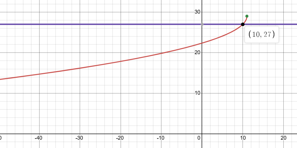 Tu dois vraiment te fier aux résultats obtenus avec tes calculs pour trouver la réponse finale. On sait que x doit être plus petit ou égal à 11 en posant la restriction (car la fonction cesse d'exister à partir de x=11, c'est-à-dire le sommet à x=h), et la solution nous dit qu'on est inférieur à y=27 si x<10. Ainsi, puisque la solution respecte la restriction, la réponse finale sera x<10, ou ]-∞, 10[.