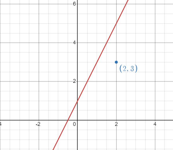 Prenons un exemple. Nous avons le point (2, 3) et la droite y=2x+1. Pour vérifier si ce point appartient à cette droite, tu dois insérer les coordonnées dans l'équation, et vérifier si l'égalité est respectée :