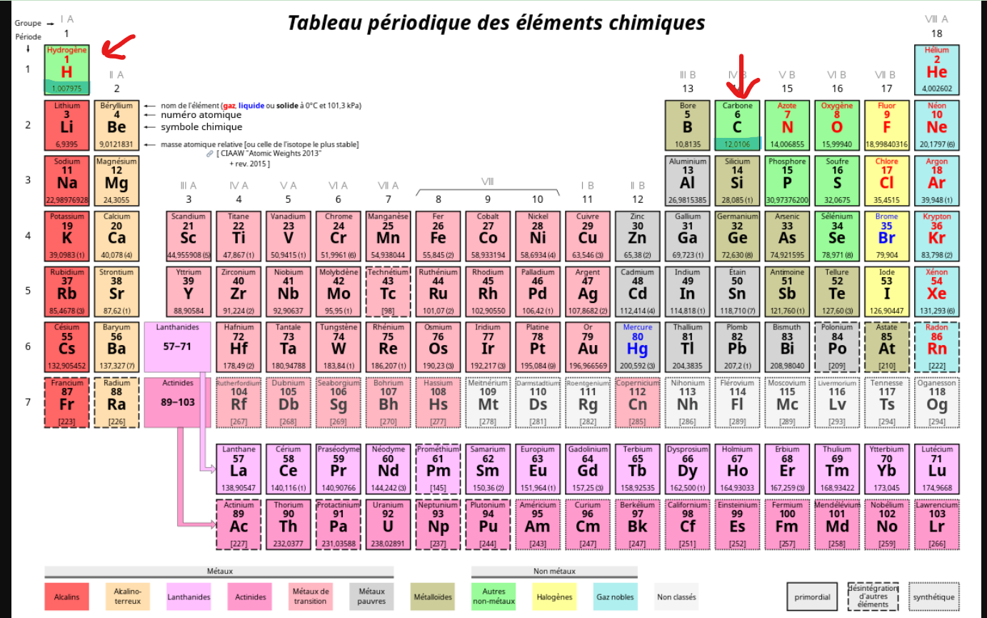 Tu dois trouver le nombre de moles dans 67 kg de \(CH_{4}\). Pour ce faire, tu dois d'abord trouver la masse molaire de cette molécule à l'aide du tableau périodique :
