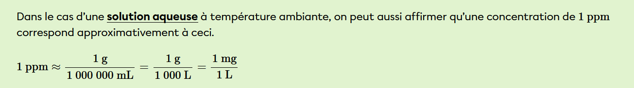 On doit donc viser une concentration en chlore inférieure à: $$4\ \text{g} / 1\ 000\ \text{L}.$$