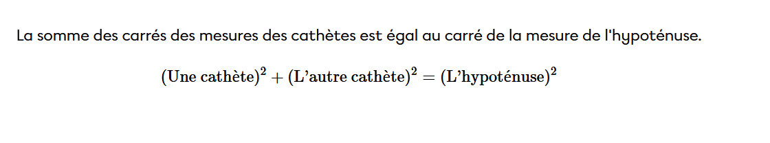 Le théorème de Pythagore (aussi appelé relation de Pythagore) s'applique uniquement aux triangles rectangles et permet de trouver la mesure d’un côté lorsqu’on connait la mesure des deux autres.