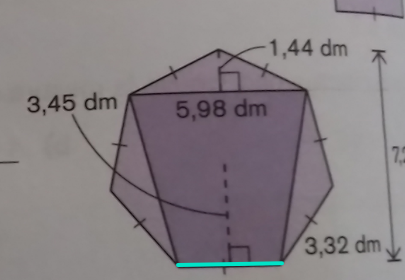 Tu pourras calculer la base du côté orange en divisant 5,98 dm par 2, puis, une fois l'aire du triangle orange trouvé, tu pourras multiplié par 2 pour obtenir l'aire totale du triangle isocèle.