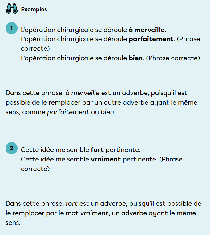 Pour repérer l’adverbe et le distinguer des autres classes de mots, il est possible d’utiliser la manipulation syntaxique du remplacement. On peut le remplacer par un autre adverbe exprimant le même sens sans rendre la phrase incorrecte.