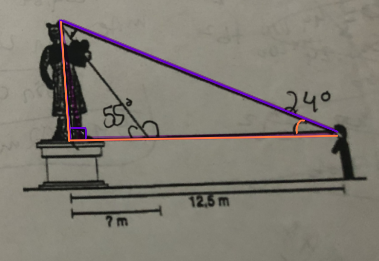 Ensuite, tu pourras trouvé la mesure de l'angle x, puis la mesure du segment inconnu en utilisant la somme des angles internes d'un triangle et encore les rapports trigos grâce à l'angle de 55 degrés donné et la mesure de la hauteur de la statue trouvée à l'étape précédente.