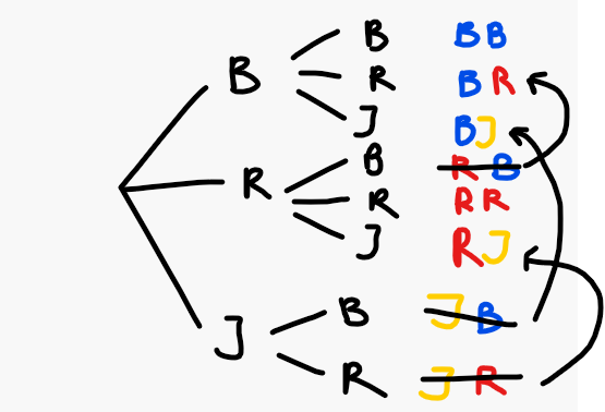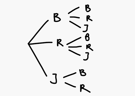 RR, RB, RJ, BR, BB, BJ, JR, JB