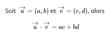 De plus, le produit scalaire de deux vecteurs se calcule comme ceci :