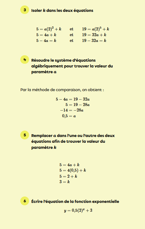 Tu dois ensuite utiliser deux couples (x,y) qu'on remplace dans l'équation \( y=a(c)^x+k \).
