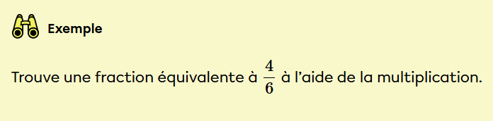 par exemple si on te demande de trouver la fraction équivalente de 4/8 tu peux faire 4x2 qui donne 8 et 8x2 qui donne 16. Dans ce cas la fractions équivalente de 4/8 sera 8/16