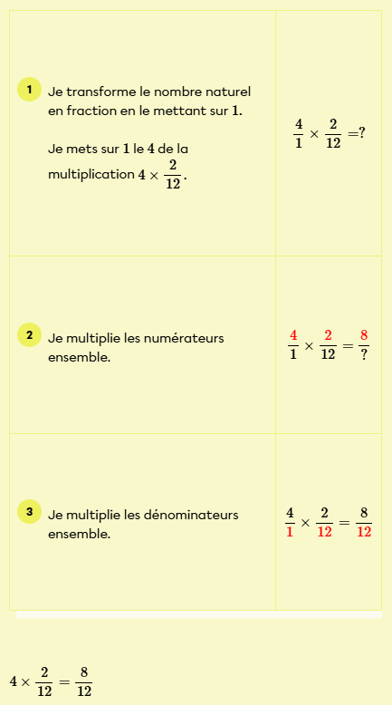 Pour multiplier une fraction par un nombre naturel à l’aide de la multiplication, je dois suivre les étapes suivantes :