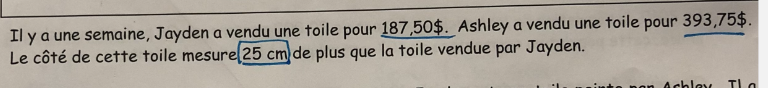 Puis, on te dit que le côté de la toile de 393,75$ d'Ashley est de 25 cm de plus que celle de Jaydan que tu as calculé à l'étape précédente. Donc, le côté de cette toile mesure 50+25 = 75 cm.