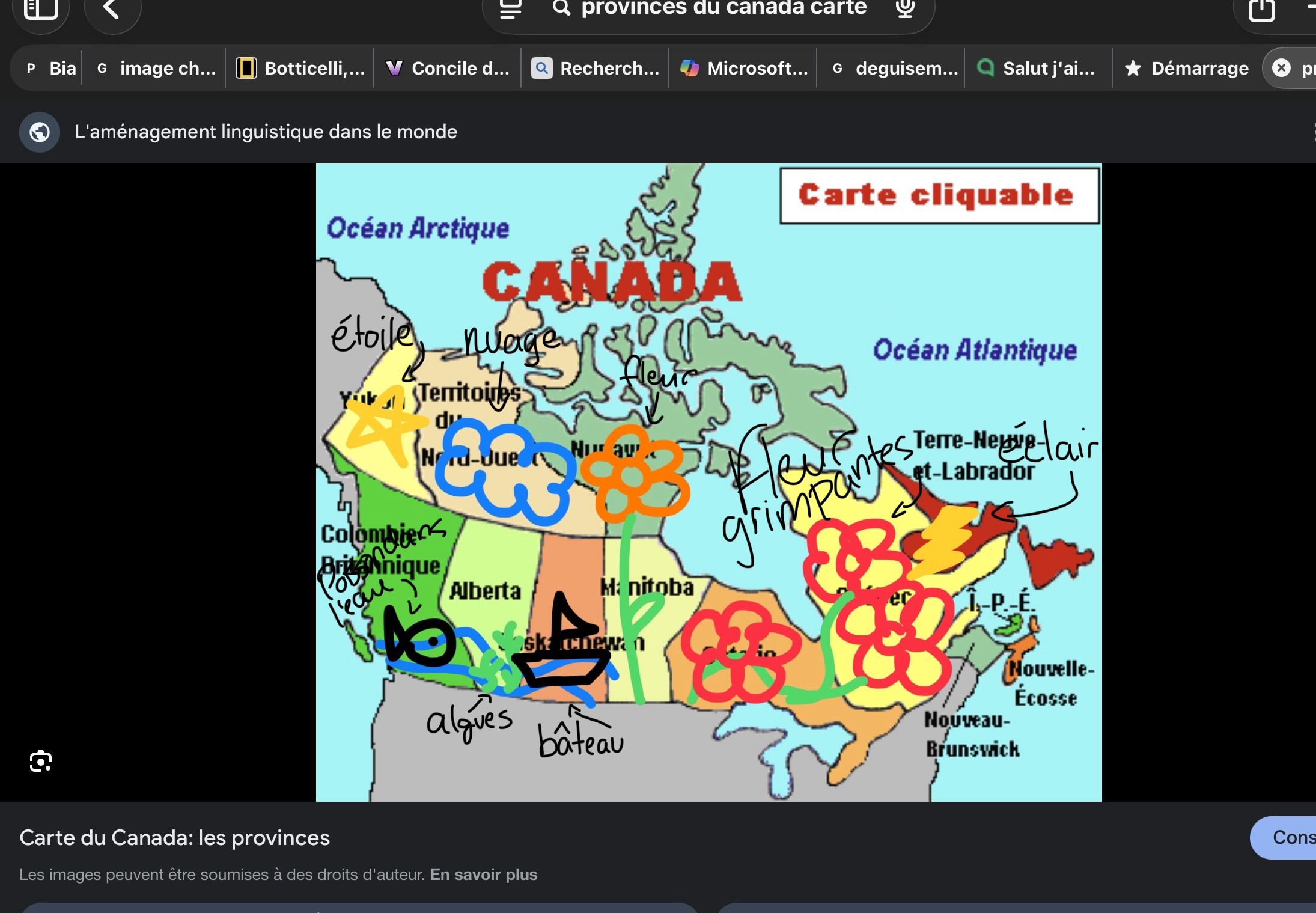 Demande à une intelligence artificielle de te les raconter en potins. Dit que le sujet c’est les océans et pays comparent leurs localisations géographique. Aussi tu peut enlever ton cahier et te donner un symbole par exemple l’Manitoba c’est la tige d’une fleur. Et que le Nunavut c’est une fleur orange. Je te met un dessin pour que tu comprenne un peut. Ensuite chacun sa technique. Comme tu peut voir j’ai fait un peut un univers,l’eau à gauche,la terre avec des fleurs ensuite le ciel avec des étoiles un eclair etc… bref,je te souhaite de la reussite dans ton examen.