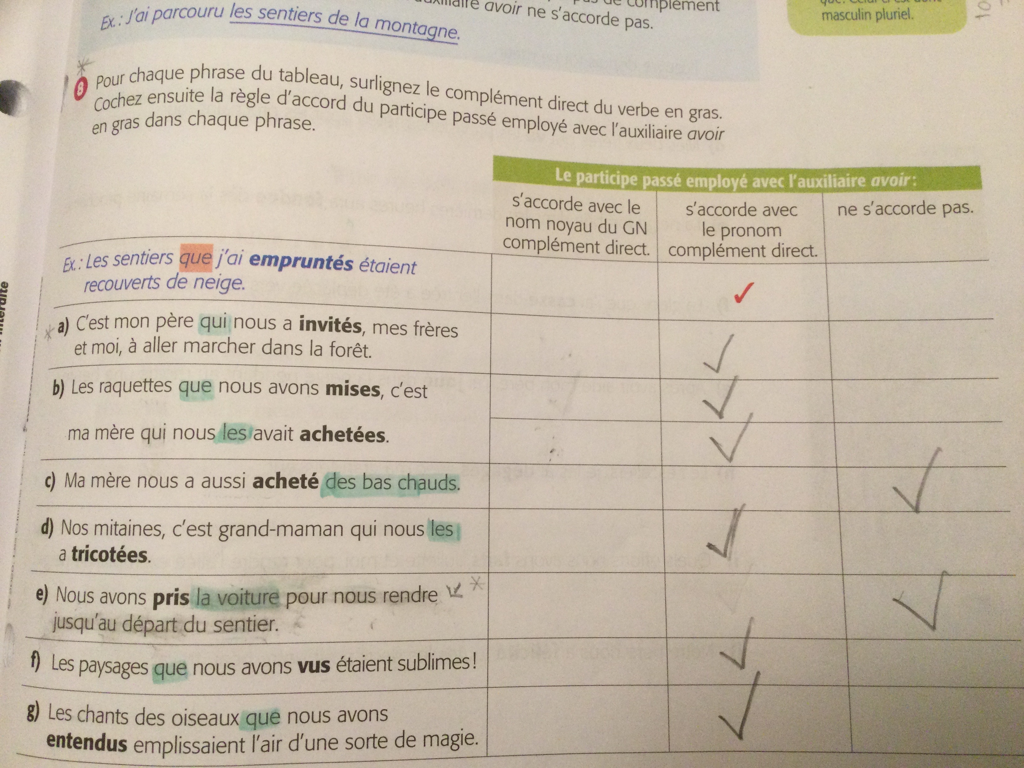 Pour la deuxième colonne, où tu as coché le même accord, ne t'en fais pas, tu sembles avoir bien compris comment fonctionne l'accord du participe passé avec l'auxiliaire avoir. Tant que tu sais que ça s'accorde, la technicalité de la raison grammaticale n'est pas super importante. Si tu souhaites la connaitre, n'hésite pas à reposer la question, ça nous fera plaisir de t'expliquer plus en détails. Cependant, certains termes dans l'explication pourront être difficile à comprendre à ton niveau du secondaire.
