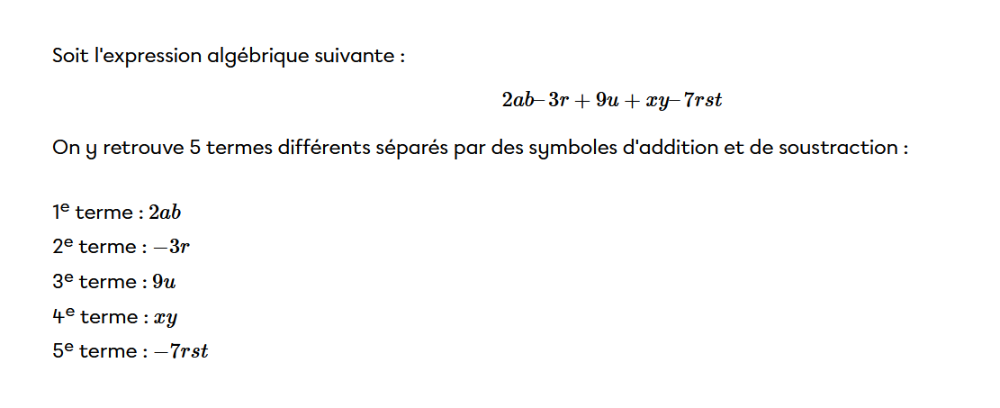 Il est possible de distinguer les termes d'une expression mathématique à l'aide des symboles mathématiques qu'elle contient. En effet, tous les termes d'une expression algébrique sont séparés par des symboles d'addition (+) ou de soustraction (-).