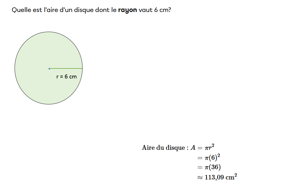 Dans l'exemple, on remplace r par 6. Pas besoin d'écrire les unités de mesure à cette étape, on les inscrit à la fin seulement.