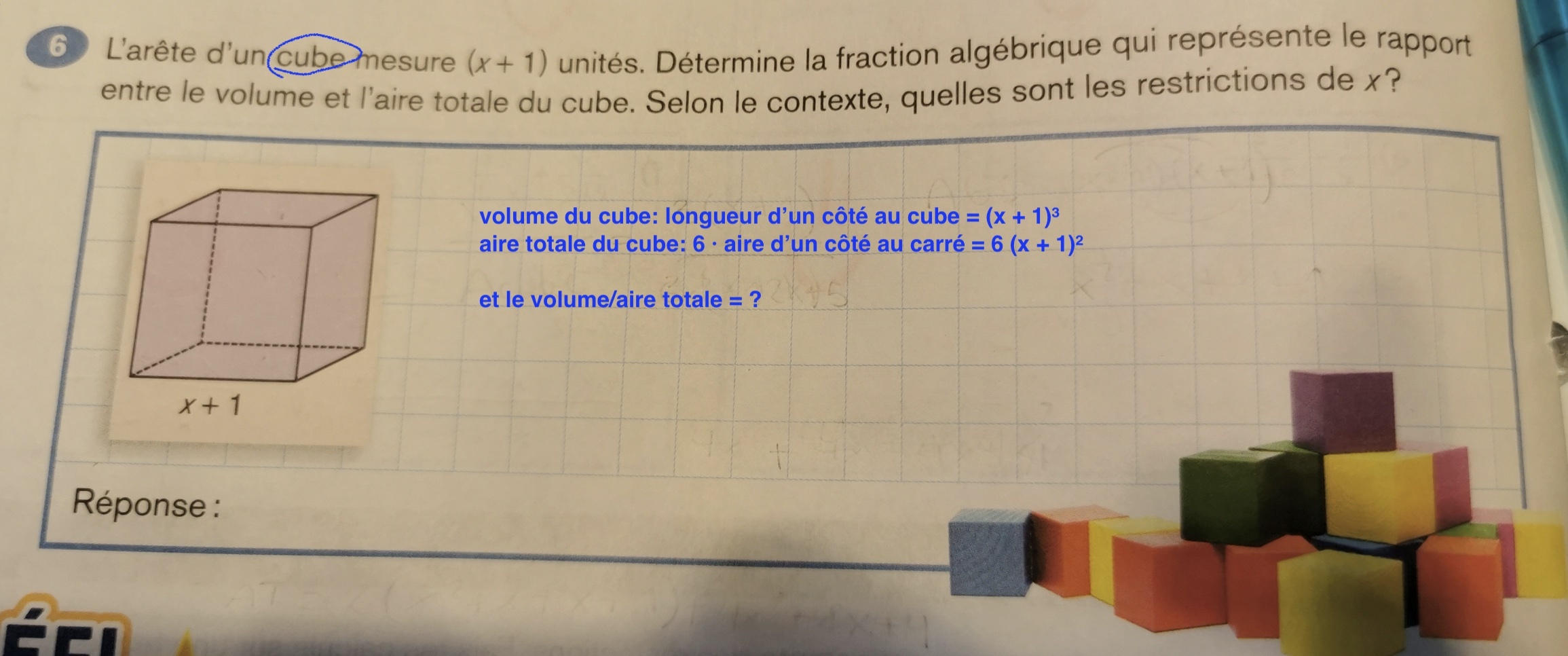 D'abord, il faut établir l'expression algébrique qui représente l'aire et le volume du cube.