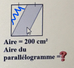 Pour le B, tu peux commencer par trouver la mesure du côté du carré à l'aide de la formule d'aire d'un carré, soit A=c², où A=200 cm². Puis, tu peux trouver l'aire des deux triangles, et soustraire ces aires de l'aire du carré pour trouver l'aire de la portion restante, soit le parallélogramme.