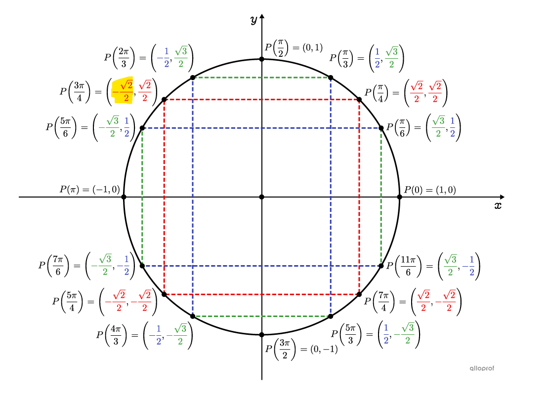 On sait que \(sec x = \frac{1}{cos x} = (cos x )^{-1}\). Nous allons donc chercher le cosinus de l'angle \(\frac{3\pi}{4}\), soit \(-\frac{\sqrt{2}}{2}\).