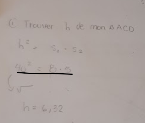 Je vois que tu as ici utilisé le théorème de la hauteur relative à l'hypoténuse. Ta réponse est la bonne, mais ta démarche n'est pas tout à fait juste, puisque l'équation ci-dessous est fausse :