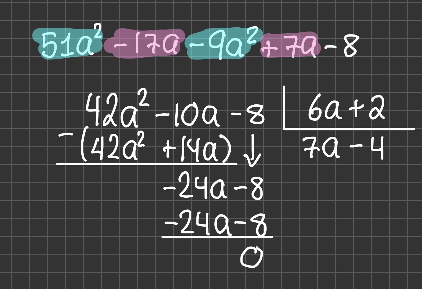 À la fin, il ne reste plus rien (reste = 0), donc la division est exacte et le résultat final est : 7a − 4.