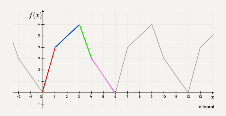 Cependant, la fonction n'a pas de pente ni de valeur initiale. En fait, chaque partie du motif périodique possède sa propre règle. En d'autres mots, la droite rouge possède une équation y=ax+b, la droite bleue aussi, la droite verte aussi, et la droite rose aussi.