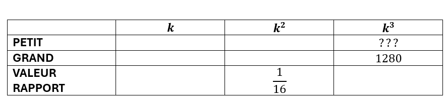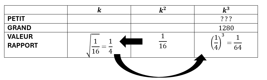 Étant donné que tu connais k², tu pourras trouver la valeur de k en effectuant la racine carrée de ce rapport. Puis, en l'élevant au cube, tu auras k³ et tu pourras utiliser ce rapport pour trouver le volume manquant: