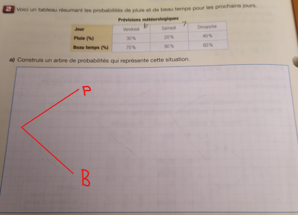 Les branches de l'arbre de probabilités doivent représenter les choix possibles. Dans cet exercice, on a deux possibilités : Pluie ou Beau temps. On peut donc commencer par tracer ces deux branches :