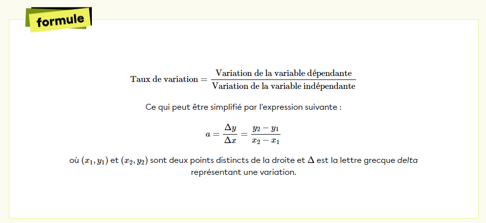 Un taux de variation symbolise la variation de la variable dépendante selon la variation de la variable indépendante. Voici une formule qui symbolise son fonctionnement :