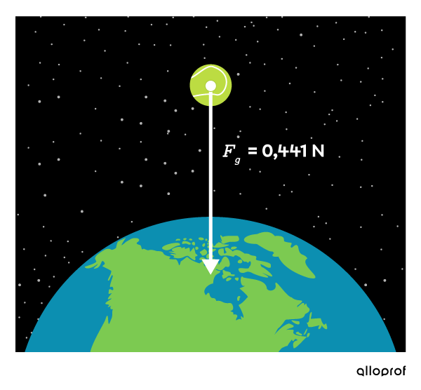 Le poids, quant à lui, représente la mesure de la force avec laquelle la Terre (ou un autre astre) attire un objet vers elle. Il a donc la même direction et le même sens que la force gravitationnelle. Tu peux le voir sur l'image suivante :