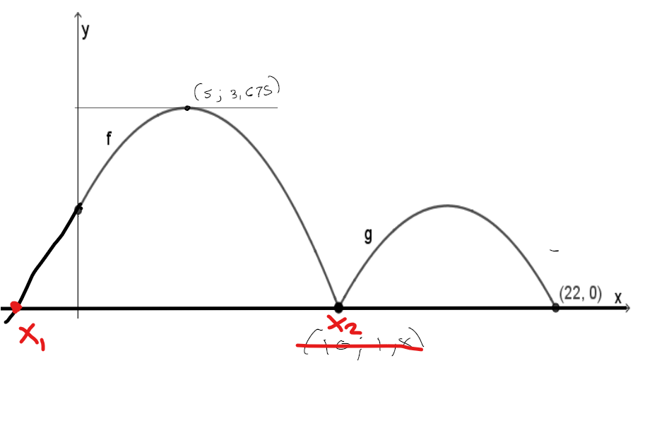 Ce que tu dois faire, c'est trouvé la coordonnée en x du second zéro de la fonction f, qui est aussi un zéro de la fonction g. Pour ce faire, tu dois résoudre l'équation suivante :