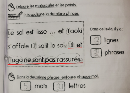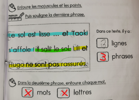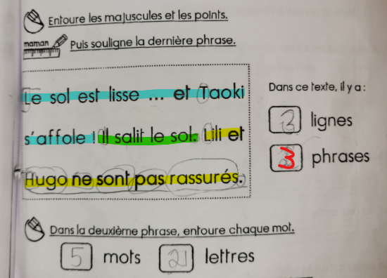Pour la dernière question, tu dois donc entourer tous les mots de la deuxième phrase, c'est-à-dire la phrase en vert : « Il salit le sol. »