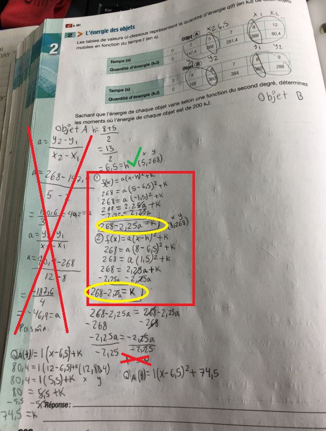 Donc, tu dois choisir un autre point. Par exemple, tu peux garder ta première équation 268-2,25a=k. Pour la deuxième équation du système, tu pourrais utiliser le point (0, 0). En fait, tu peux utiliser n'importe quel de ces points :