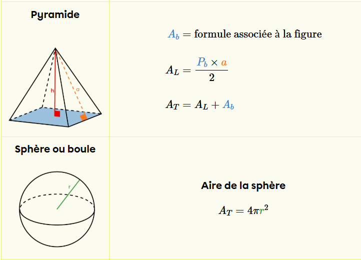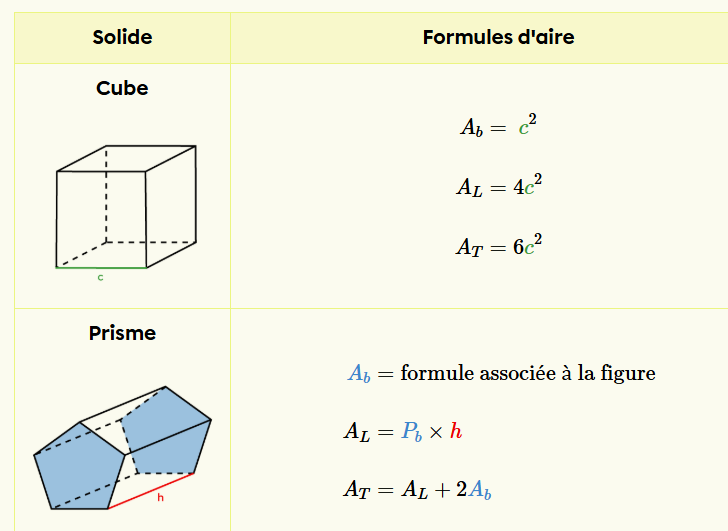 Je t'invite à consulter la fiche suivante, tu y trouveras des liens vers des fiches pour t'aider à calculer l'aire de chaque type de solide : L'aire et le volume des solides | Secondaire | Alloprof