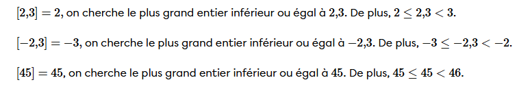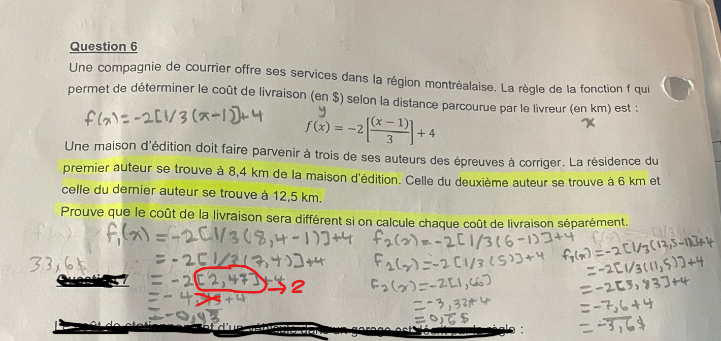 Concernant la question 6, attention, tu dois te rappeler que, si on cherche la partie entière d'un nombre, alors on doit enlever la partie décimale et garder uniquement la partie entière. Dans tes calculs, tu traites les crochets de la partie entière comme des parenthèses, ce qui n'est pas la même chose ;)