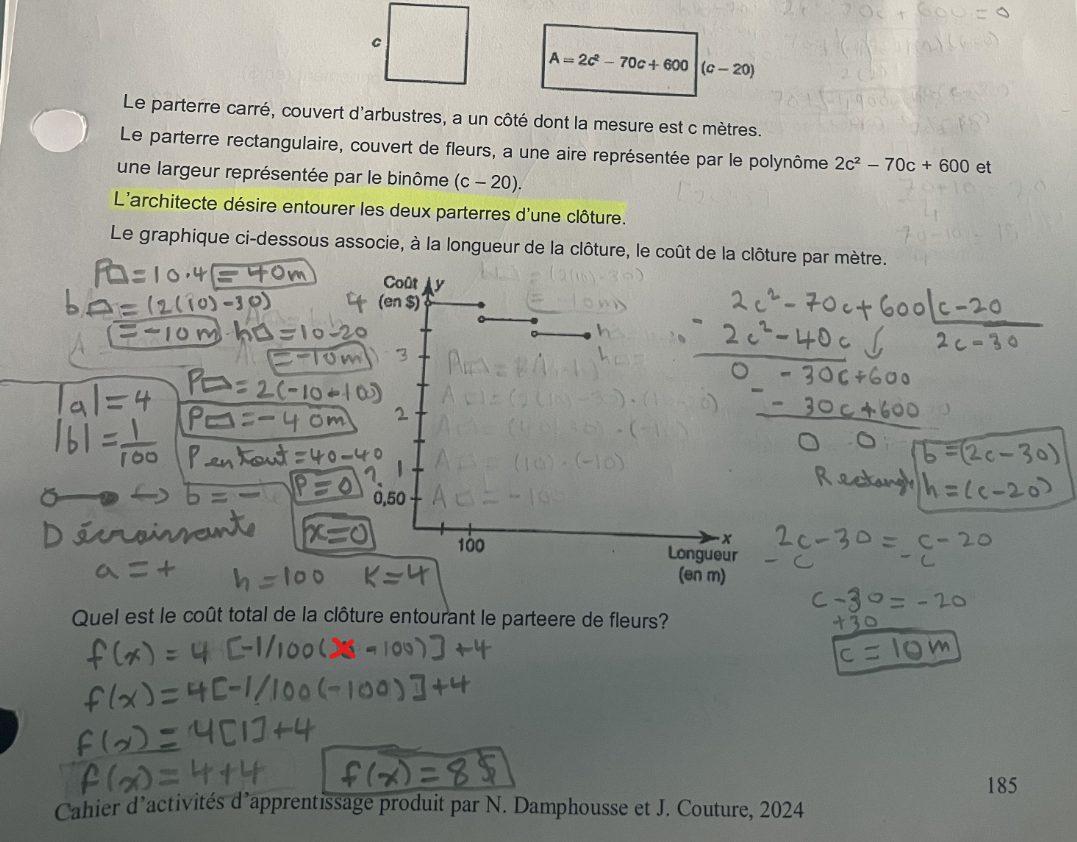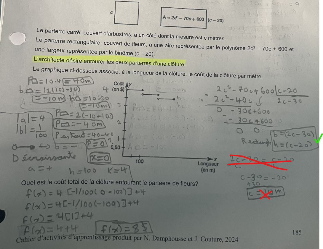 Une fois que tu as la bonne règle et la longueur totale du contour des deux formes, tu dois remplacer x dans l'équation de la fonction par cette longueur totale pour trouver le coût total. Ici, tu as remplacé x par 0, donc tu cherches le coût pour une longueur de 0 mètre. Ce n'est pas ce qu'on cherche ;)