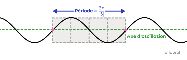 Dans la fonction sinus transformée, la période (p) correspond à l’écart entre les 2 valeurs de x aux extrémités d’un cycle.