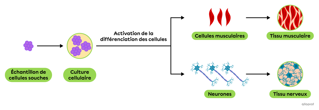 - Elle peut aussi se transformer en d’autres types de cellules, qu'on appelle des cellules spécialisées (par exemple : une cellule musculaire, une cellule de peau, une cellule sanguine, etc.).