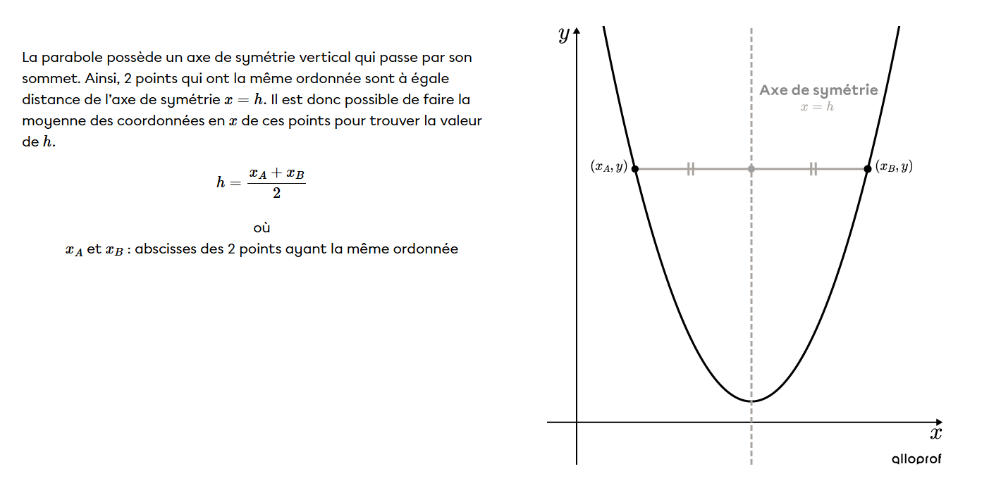 Puisque tu as deux points de même ordonnée (6, 6) et (0, 6), tu peux calculer le paramètre h en trouvant le milieu en x de ces deux points :