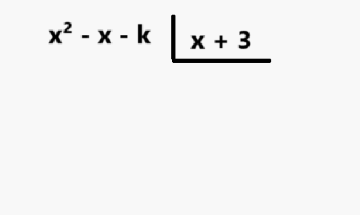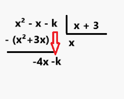 Tu dois commencer par trouver le premier terme qui nous permet d'éliminer le \(x^2\) du dividende lorsqu'on le multiplie par le diviseur (x+3). C'est \(x\). On met donc \(x\) en dessous du crochet, puis on multiplie \(x\) par (x+3), et on soustrait le résultat de notre dividende (x²-x-k) :
