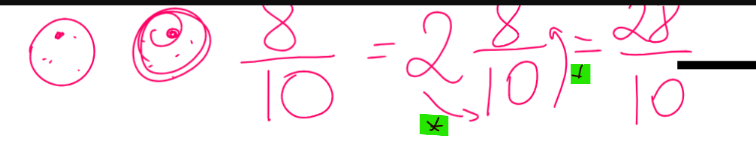 Ce qui nous donne : 2 × 10 = 20, puis 20+8 =28, donc une fraction équivalente à 2 \(\frac{8}{10}\) est \(\frac{28}{10}\). On peut ensuite réduire cette fraction pour avoir une fraction irréductible.