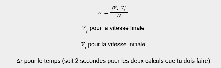 Vu qu’on cherche l’accélération moyenne il faut utiliser cette formule (2 fois, une pour la composante x et une pour la composante y) :