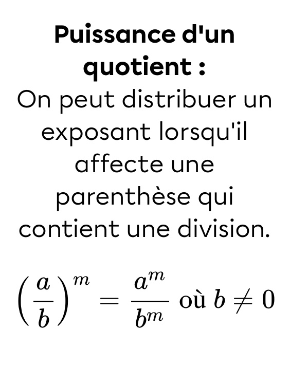 Lorsque tu as un exposant sur une fraction, tu dois simplement distribuer l’exposant sur le numérateur et sur le dénominateur.