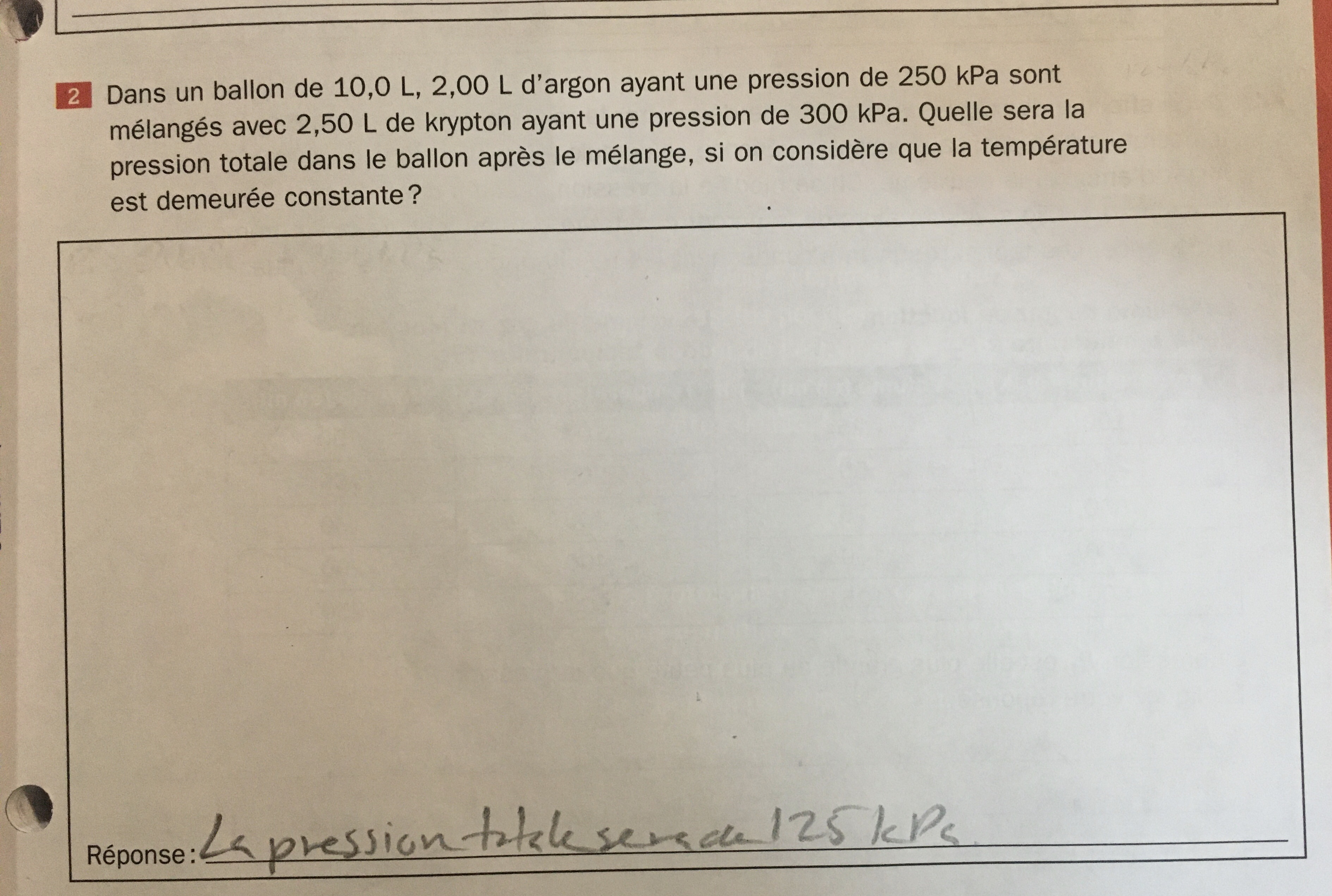 Secondary V • 3yr.bonjour, je ne comprends pas pourquoi le volume est différent. Dans mon cahier, cest ecrit puisque ca depend de la quantité de particules, cest pour ca pourquoi le volume d'un gaz nest pas conservés au cours d'une reaction.