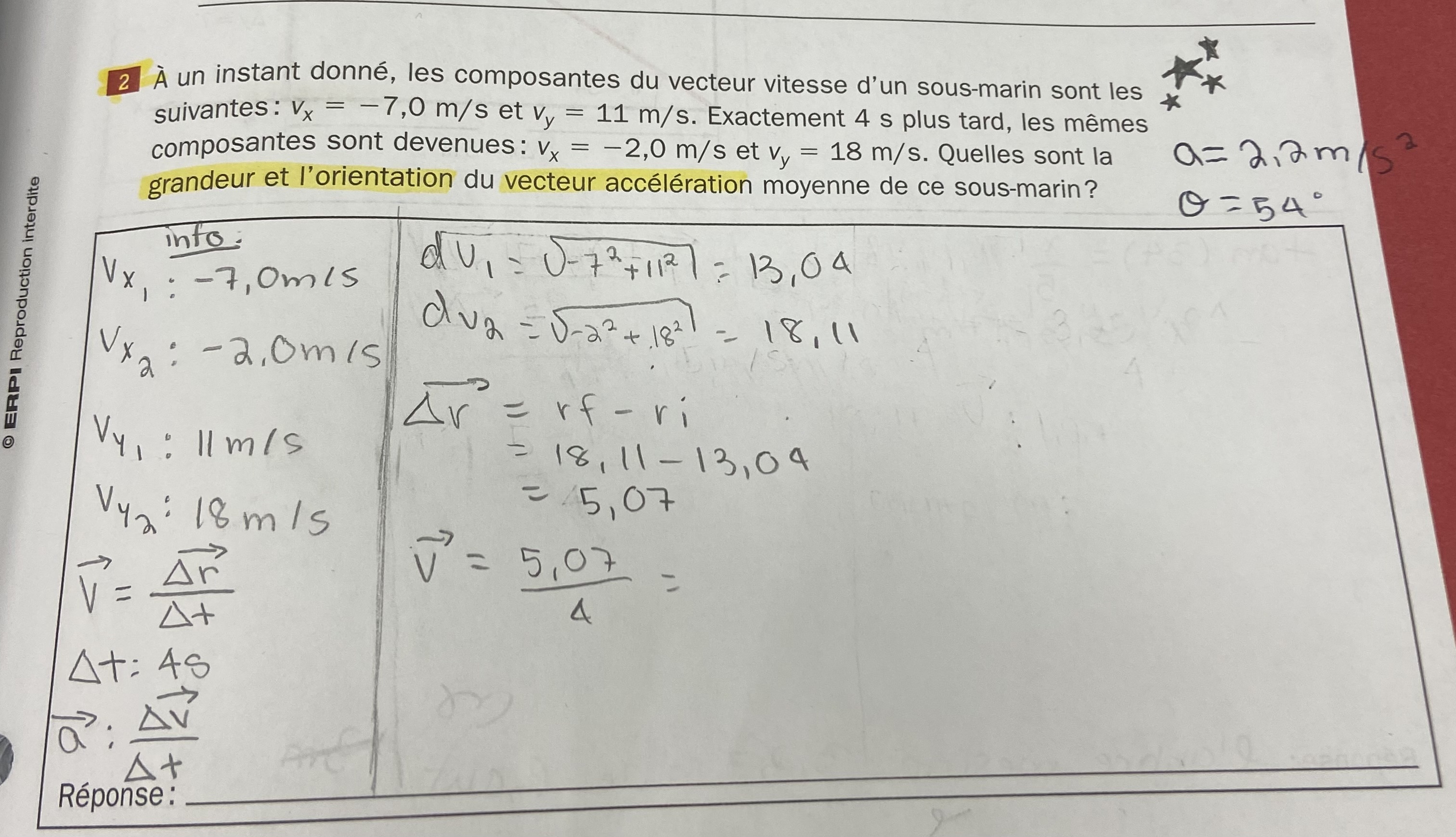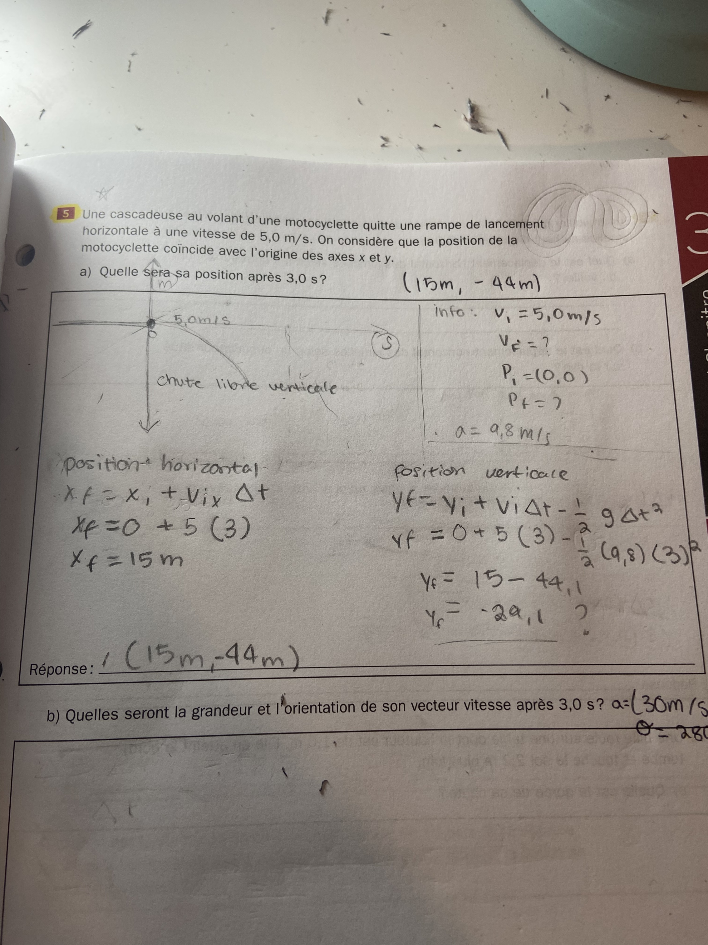 Secondary V • 2yr.Bonjour, j’ai besoin d’aide pour un devoir en physique, je suis bloqué dessus, je voudrais si possible une proposition, une démarche, pour résoudre ce problème: Une acrobate est propulsée dans les airs par un canon faisant un angle de 45° au-dessus de l'horizontale. Calculez la norme et l'orientation de la vitesse (vecteur vf) de l'acrobate, lorsqu'une distance verticale de 3,50 m la sépare du sol dans sa phase descendante et que la vitesse initiale est vi = 23,5 m/s. Écrivez le vecteur vf en utilisant la méthode de l'angle trigonométrique.