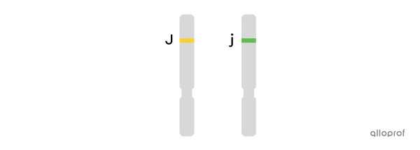 Par exemple, le chromosome 1 pourrait détenir l'allèle J, alors que le chromosome 2 détiendrait l'allèle j. Les deux gènes sont situés au même emplacement, et codent pour une caractéristique commune (par exemple, la couleur des yeux). Lorsque deux allèles sont identiques sur une paire de chromosomes (par exemple JJ), ils exprimeront la même caractéristique. Lorsqu'ils sont différents, ce sera la caractéristique du gène dominant qui sera exprimée (l'allèle le "plus fort"), ou aucune ne sera exprimée.