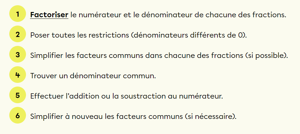 On doit toujours commencer par factoriser toutes les fractions. Ensuite, il ne faut pas oublier les restrictions.