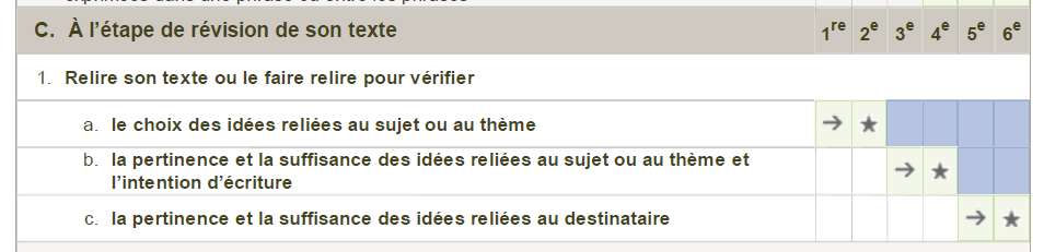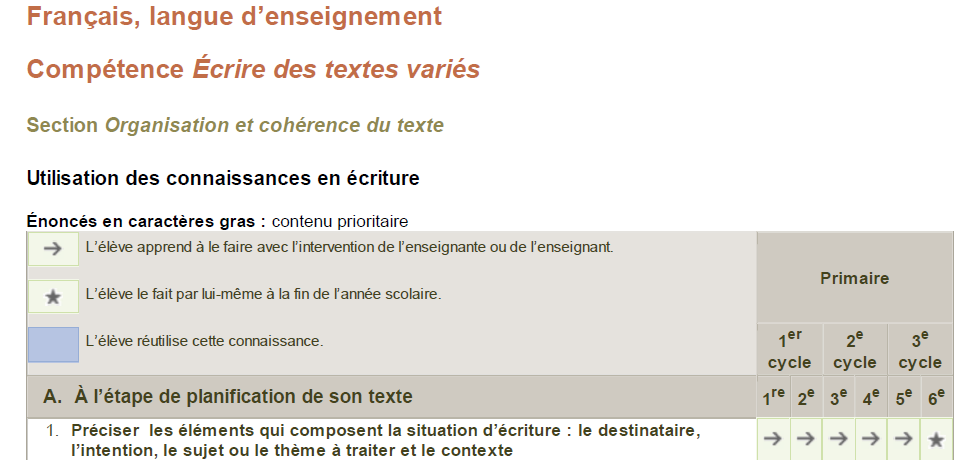 Par exemple, à chacun des cycles, les objectifs diffèrent entre apprendre à le faire avec l'aide de l'enseignant.e et y arriver seul.e (les flèches et les étoiles dans la colonne de droite).