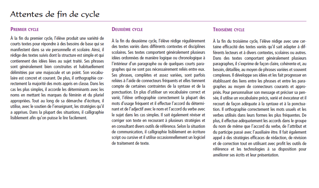 Ici, on évalue la compétence Écrire des textes variés. On peut donc lire ce passage (p.76 à 79) pour se remémorer en quoi consiste la compétence. On peut déjà y voir que les attentes de fin de cycle diffèrent pour les deuxième et troisième cycle (on pourrait faire deux grilles différentes alors pour chacun des cycles, ou pour ton travail, choisis le niveau qui te plait).