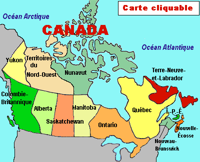 Le Canada est composé de 10 provinces : la Colombie-Britannique, l'Alberta, la Saskatchewan, le Manitoba, l'Ontario, le Québec, le Nouveau-Brunswick, l'Île-du-Prince-Édouard, la Nouvelle-Écosse et Terre-Neuve-et-Labrador, et de 3 territoires : le Yukon, les Territoires du Nord-Ouest et le Nunavut.
